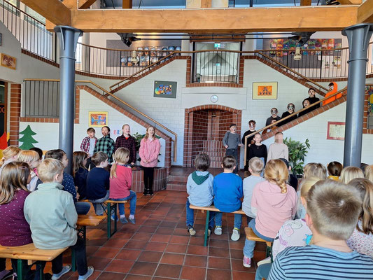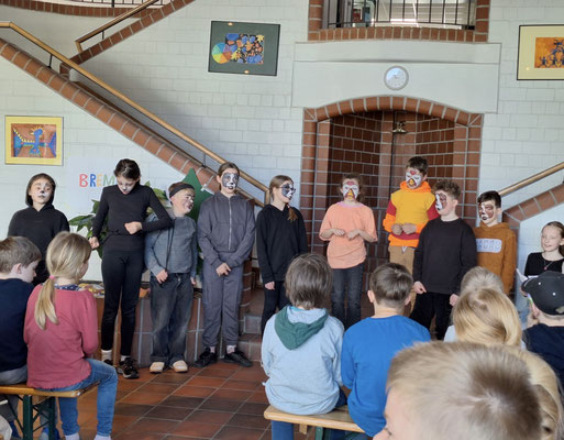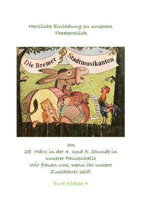 Am 28.03. durfte sich die ganze Schule das Theaterstück der 4. Klasse zu den Bremer Stadtmusikanten anschauen. Das Theaterstück wurde dabei musikalisch von der 3a begleitet. Die 4. Klasse und auch die 3a haben in der letzten Zeit fleißig mit Frau Rörig für die Aufführung geprobt.